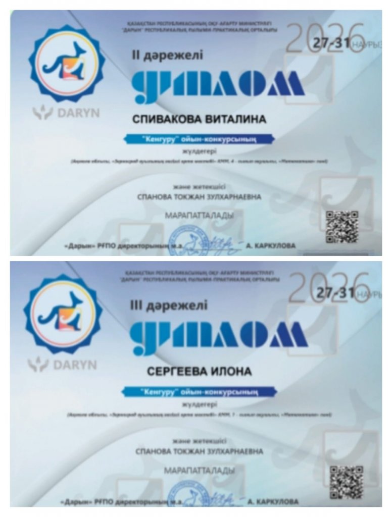 31 наурызда 1-сынып оқушысы Сергеева Илона мен 4-сынып оқушысы Виталина Спивакова республикалық «Кенгуру» математикалық сайыс ойынына қатысып, жүлделі орындарға ие болды. Құттықтаймыз және барлық істе сәттілік тілейміз! Жалғастырыңыз! Жарайсындар!