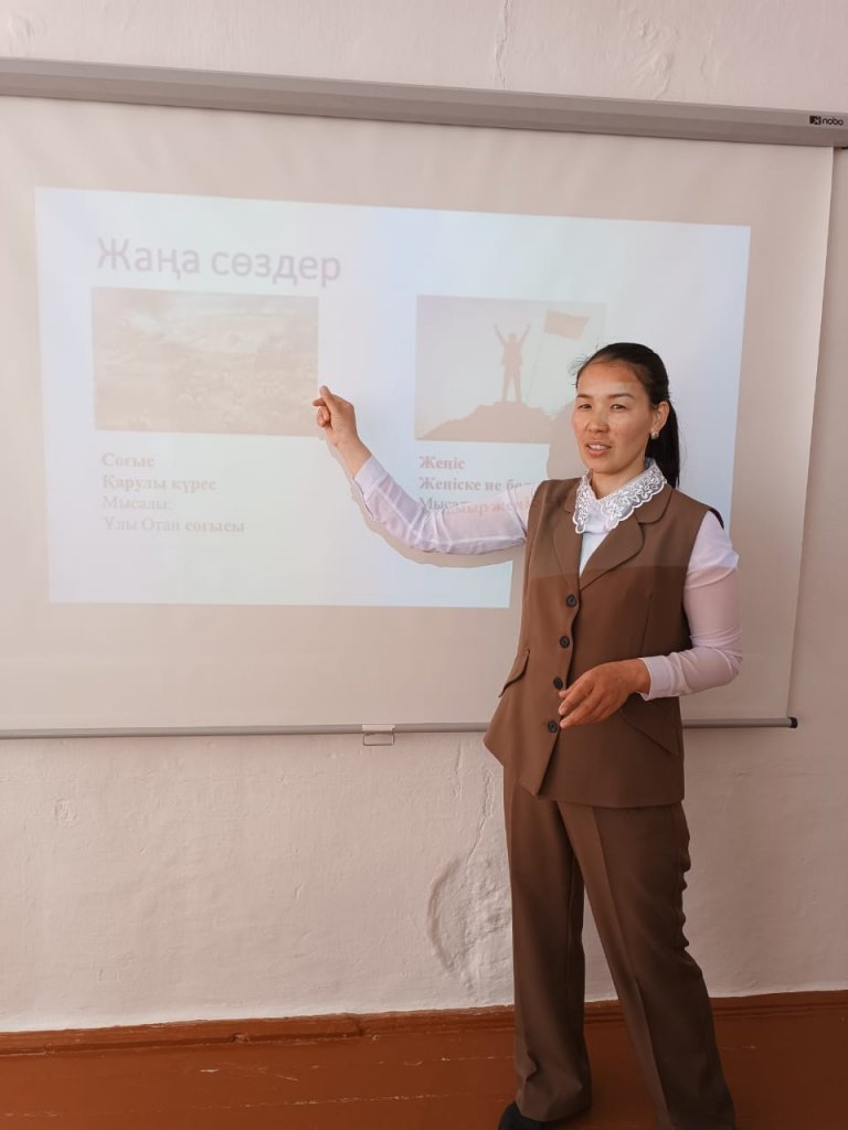 Материал 5-сыныптың 13 тақырыбының 1-сабағы.Алда келе жатқан жеңіс күніне орай өткізілген ашық сабақ. Сабақ барысында «Жалғасын тап» әдісінің мақсаты оқушылардың сөздік қорымен қатар есте сақтау сонымен қатар шапшаңдыққа баулу болды; «Есте сақта» айдарында Рихстаглқа ту тіккен батырларымыз Рақымжан Қошқарбаев және Григорий Булатовтармен танысты.
